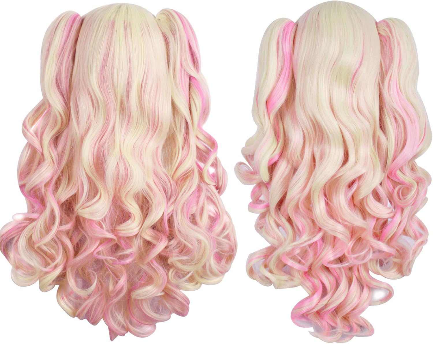 MapofBeauty Multi-color Lolita Long Curly Clip on Ponytails Cosplay Wig (Blonde/Pink)