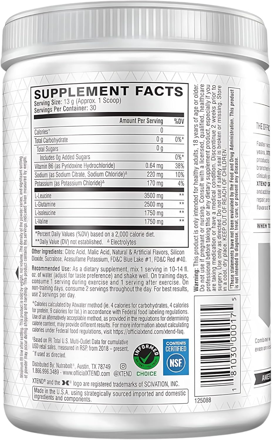 XTEND Original BCAA Powder Glacial Grape, ZERO CALORIE, ZERO CARB, ZERO SUGAR, Post Workout Muscle Recovery Drink with Amino Acids, 7g BCAAs for Men & Women, 30 Servings