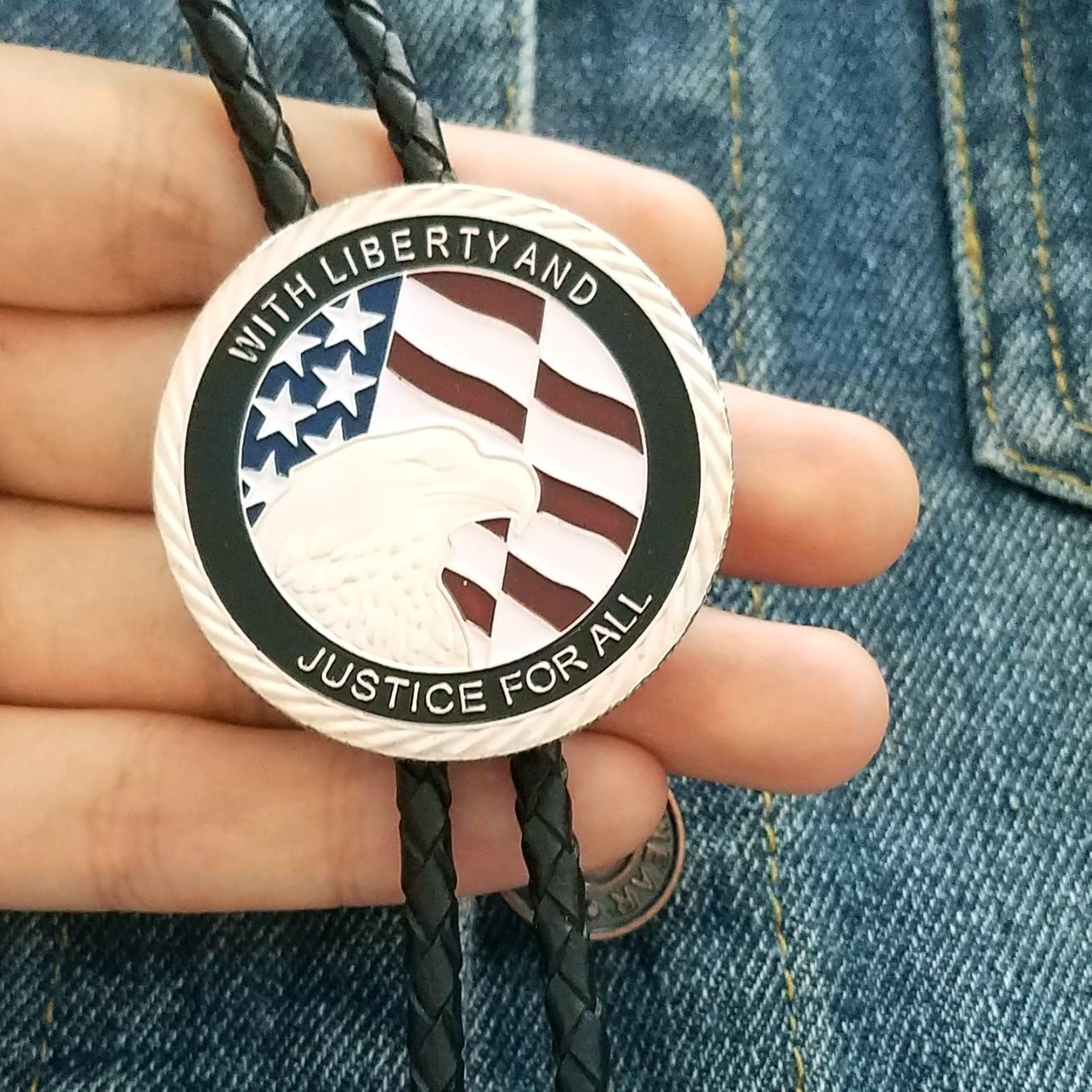 SELOVO Genuine Leather American Flag Eagle Bolo Tie Silver Tone Colored