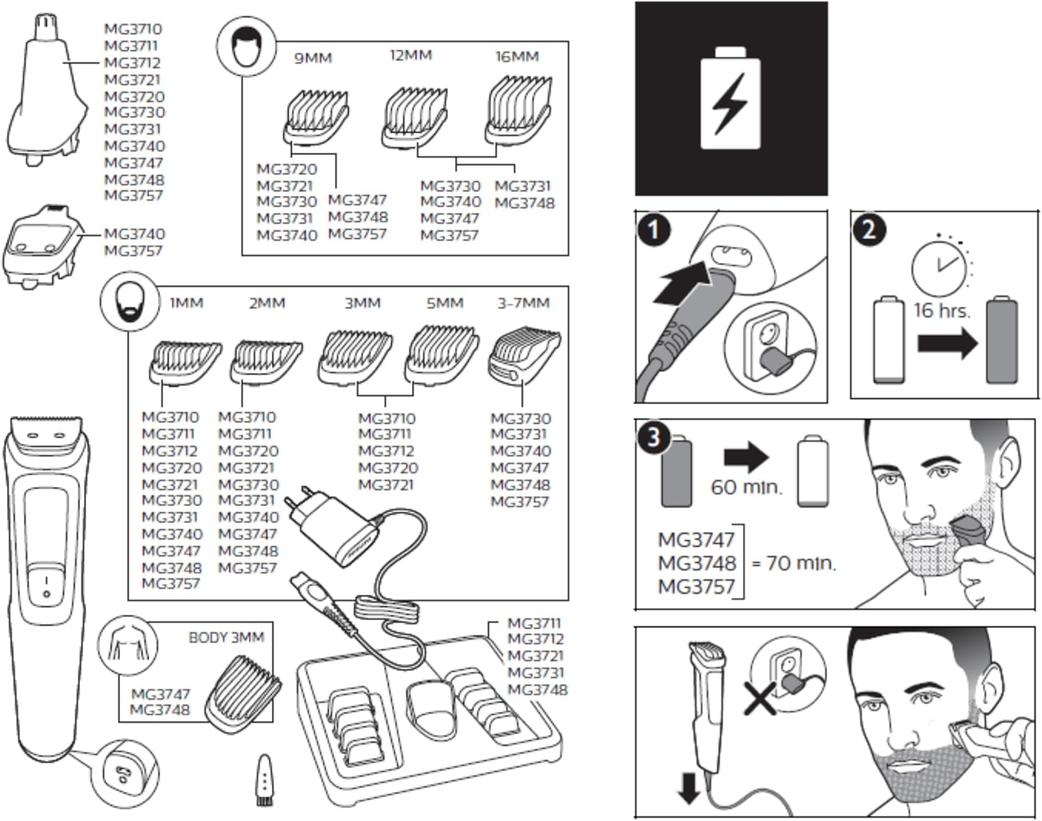Philips Multigroom Series 3000 for Face, 6-in-1 Grooming Kit for beard, moustache, nose & ear hair, cordless, 60 min runtime, 16h full charging time, MG3710/33,Black [NEW] MG3710/33, 6-in-1
