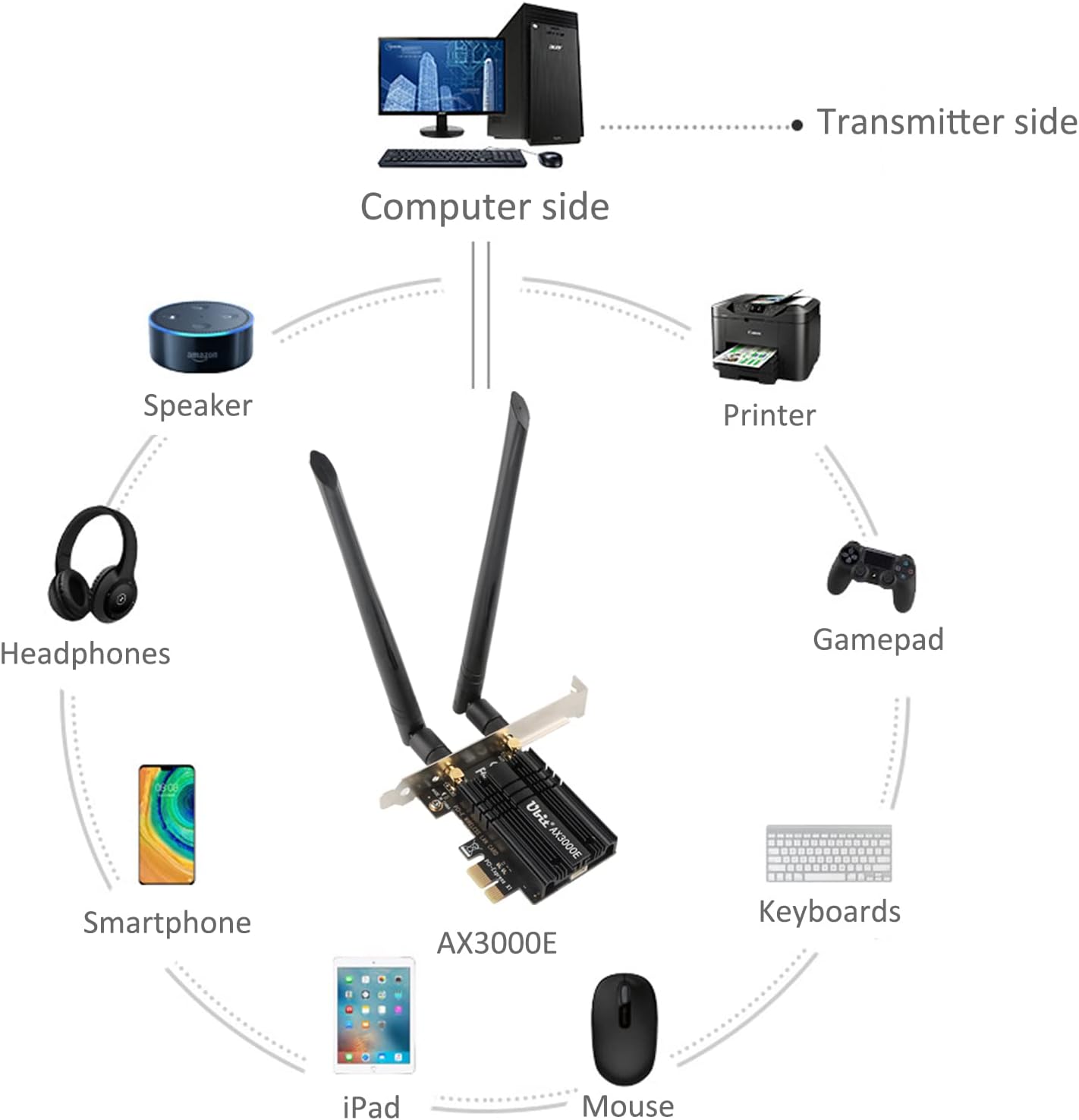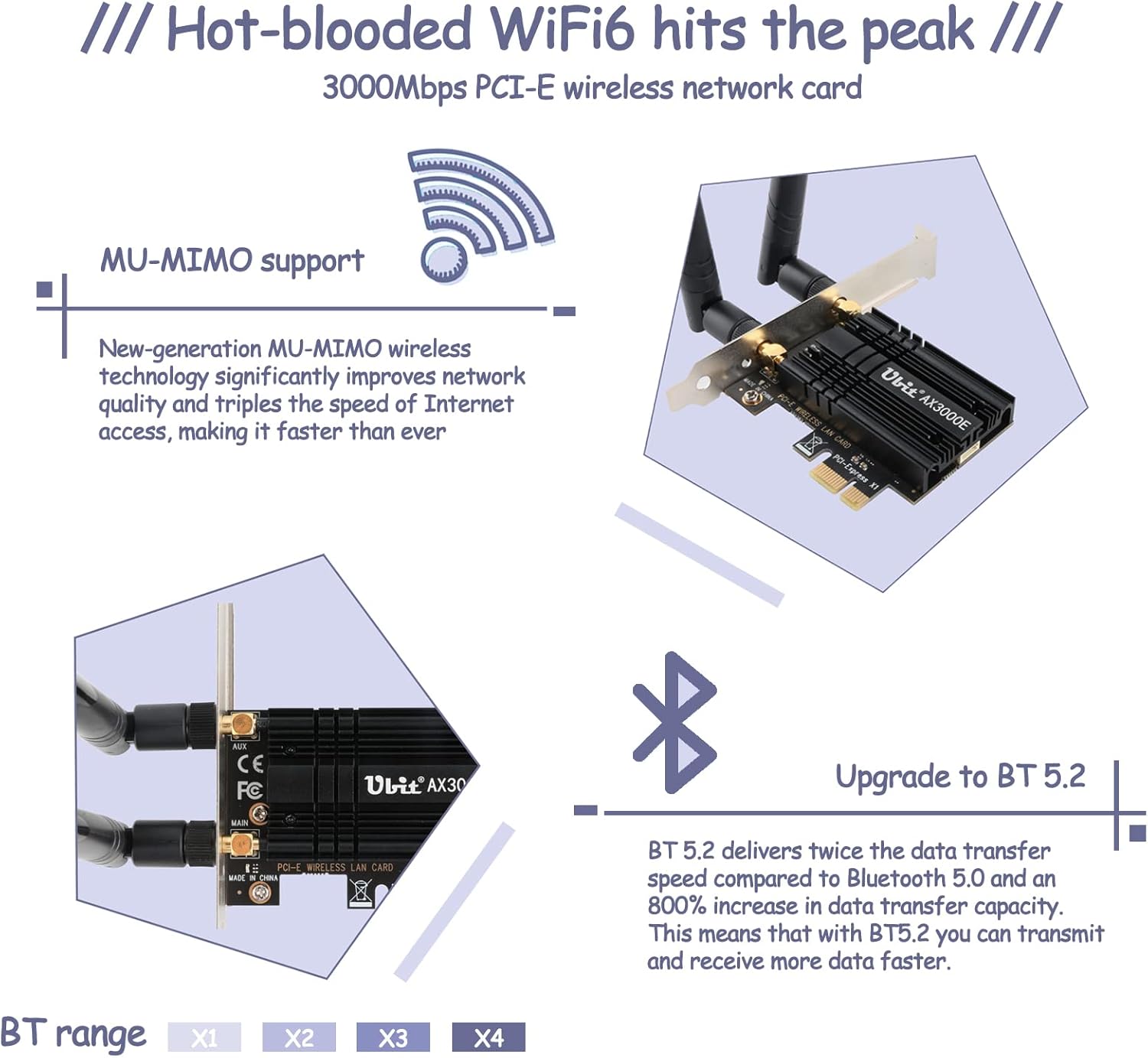 Ubit WiFi 6 AX3000E PCIE WLAN card, Max 2974Mbps, Tri-Band (6G/5G/2.4G), BT 5.2, OFDMA, MU-MIMO, Ultra Low Latency, WIN10/11.64bit