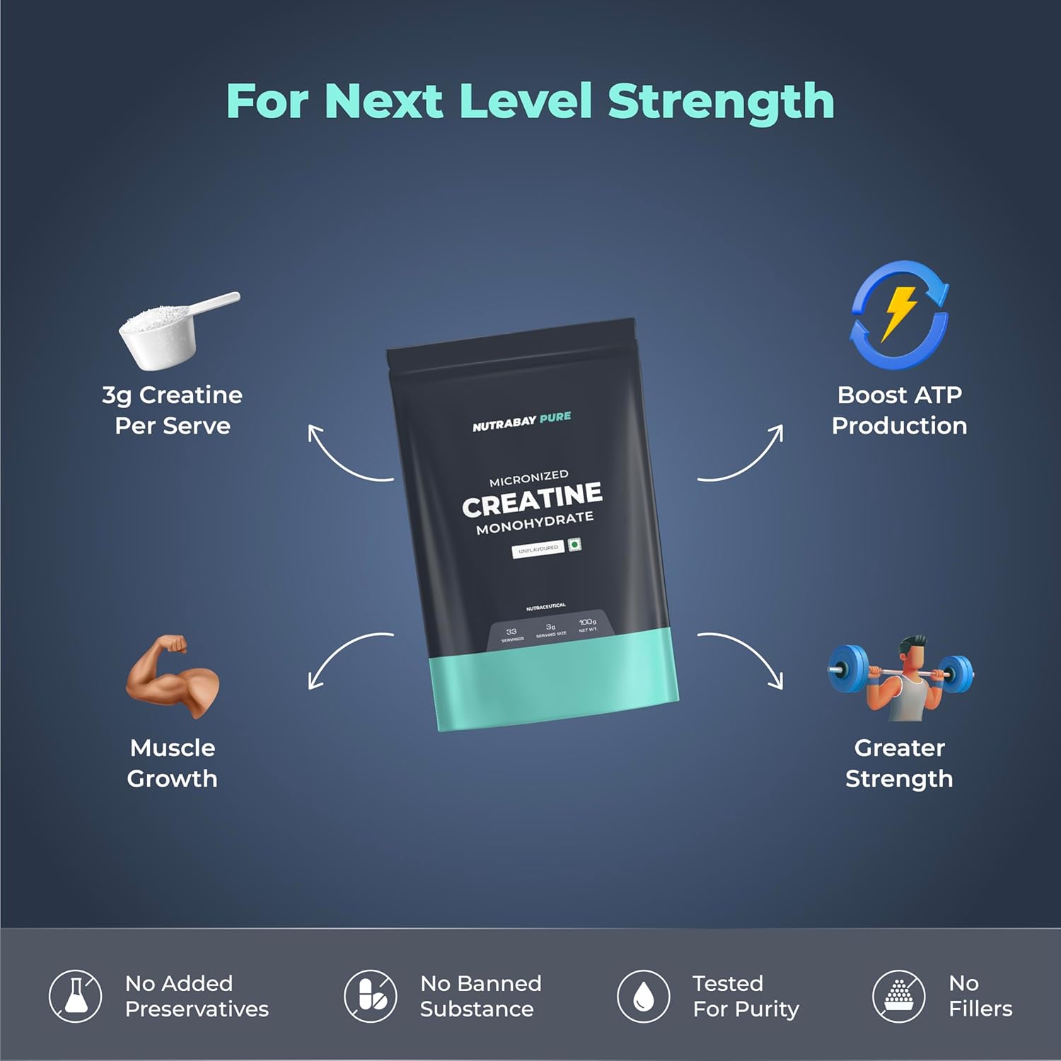 - Nutrabay Pure Creatine Monohydrate contains 3g of fast absorbing micronized creatine in each serving for rapid absorption rate with faster results in building strength and endurance