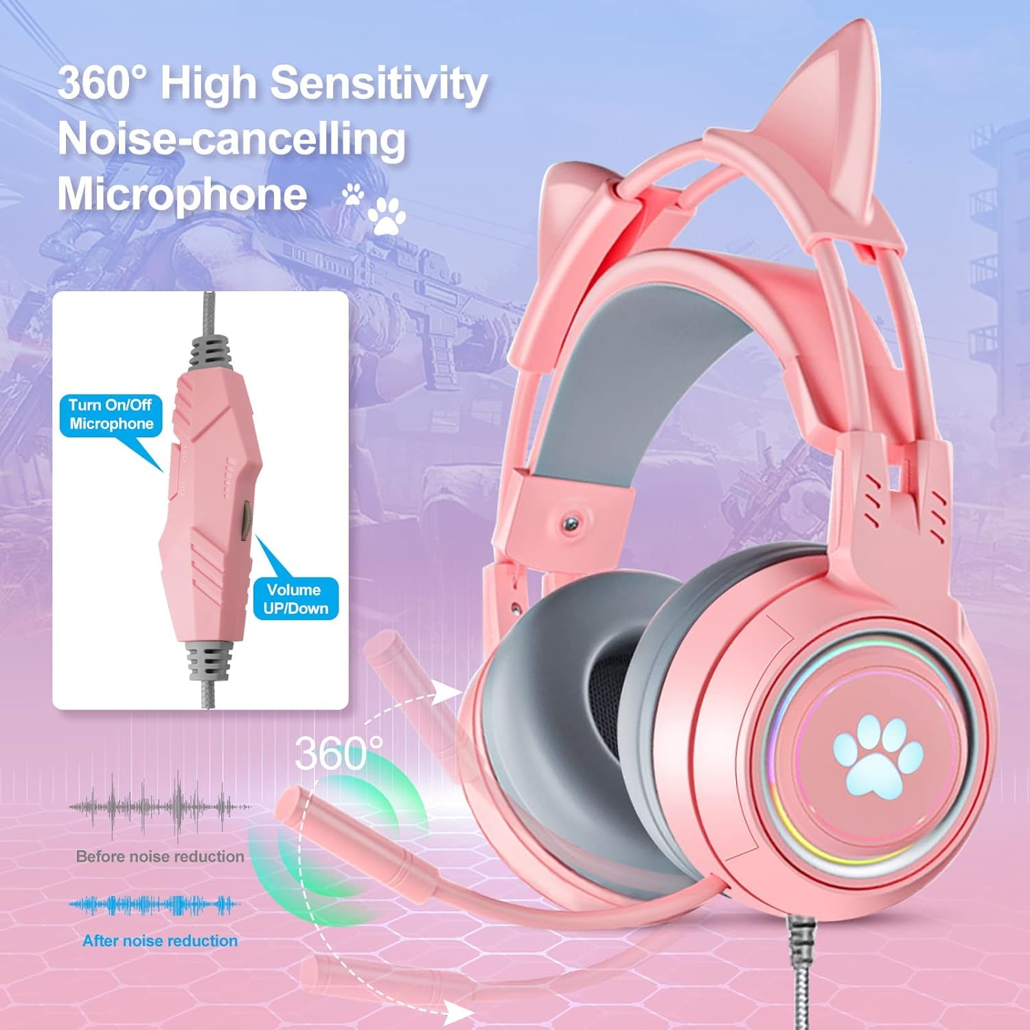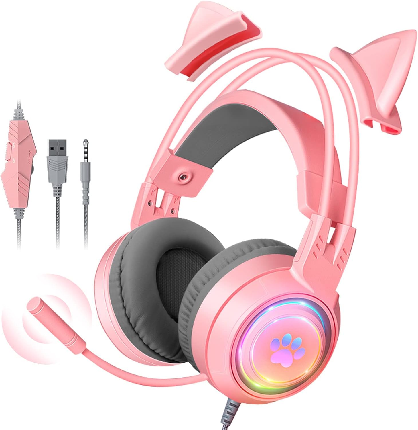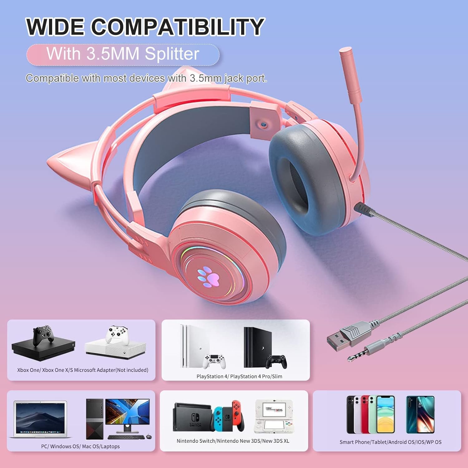 MAKINGTEC Bluetooth Wireless Headphones, Over Ear Headphones, Cat Ear Kids Gaming Headset with Microphone for Laptop/PC /PS4 /PS5 /Xbox/Nintendo Switch, RGB Light Up 3.5mm Wired USB Headset (Pink)