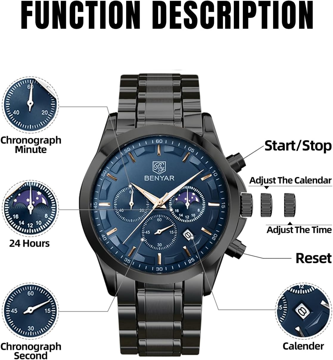 - 【⌚The Analog Watch】BY BENYAR offers a range of classic designer wrist watches specially crafted for men. The watch combines multifunction dial and a built-in date calendar feature that displays the date