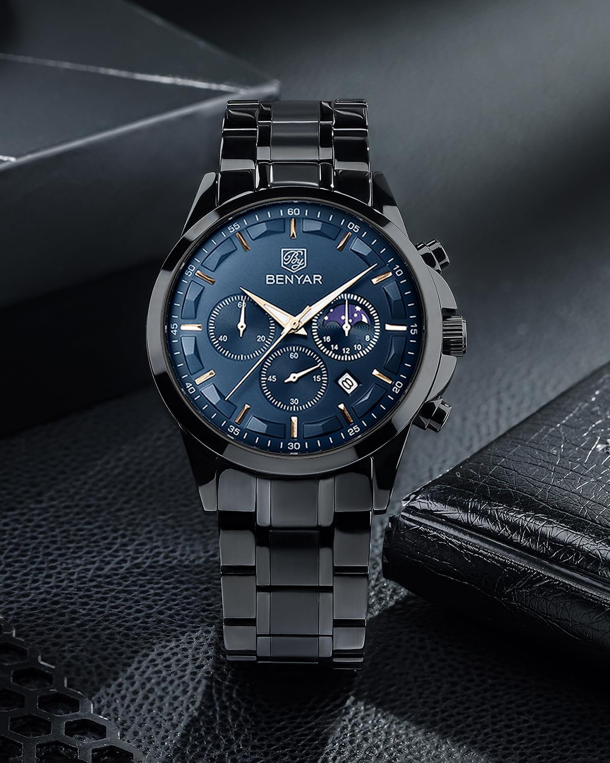 BY BENYAR Men's Watch Water-Resistant Chronograph Elegant Leather Strap/Stainless Steel Quartz Movement Birthday Gift Black Steel/Black dail/Blue face