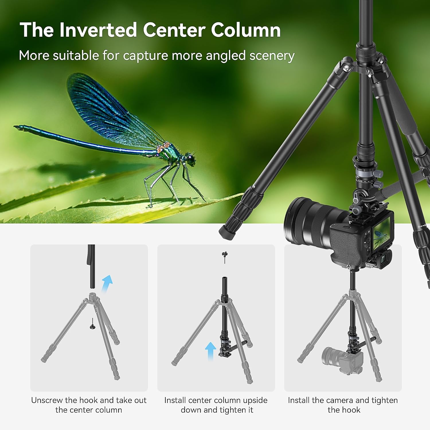 - 【Flexible Shooting Angles】The aluminium travel tripod offers a quick-angle adjustment plate buckle that easily switches between three shooting angles (23°/55°/87°) based on your scene. It features an inverted center column for low angle shots and macro photography. Additionally
