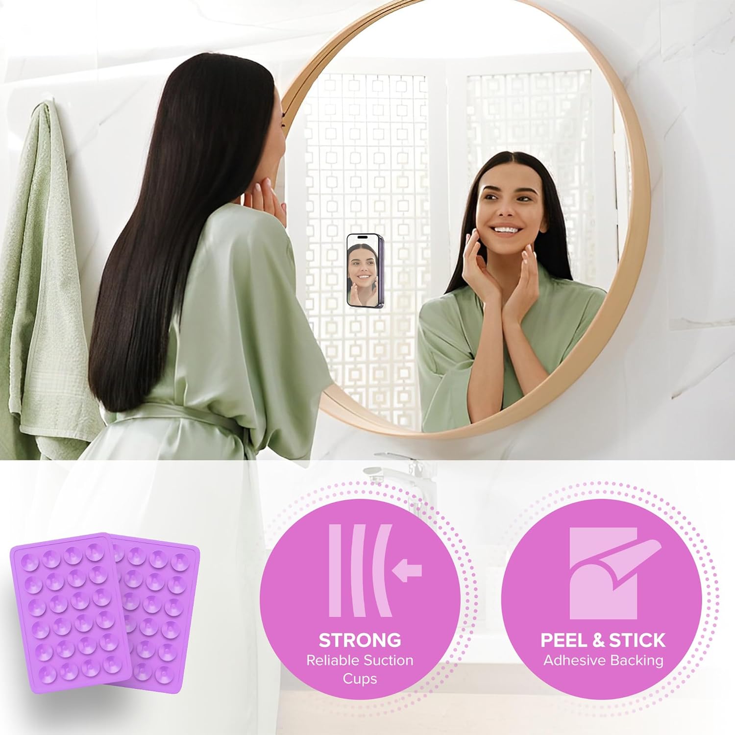 - Hands-Free Phone Holder – This innovative phone suction cup mount for cell phone cases attaches to the back of your smartphone and lets you adhere it to mirrors