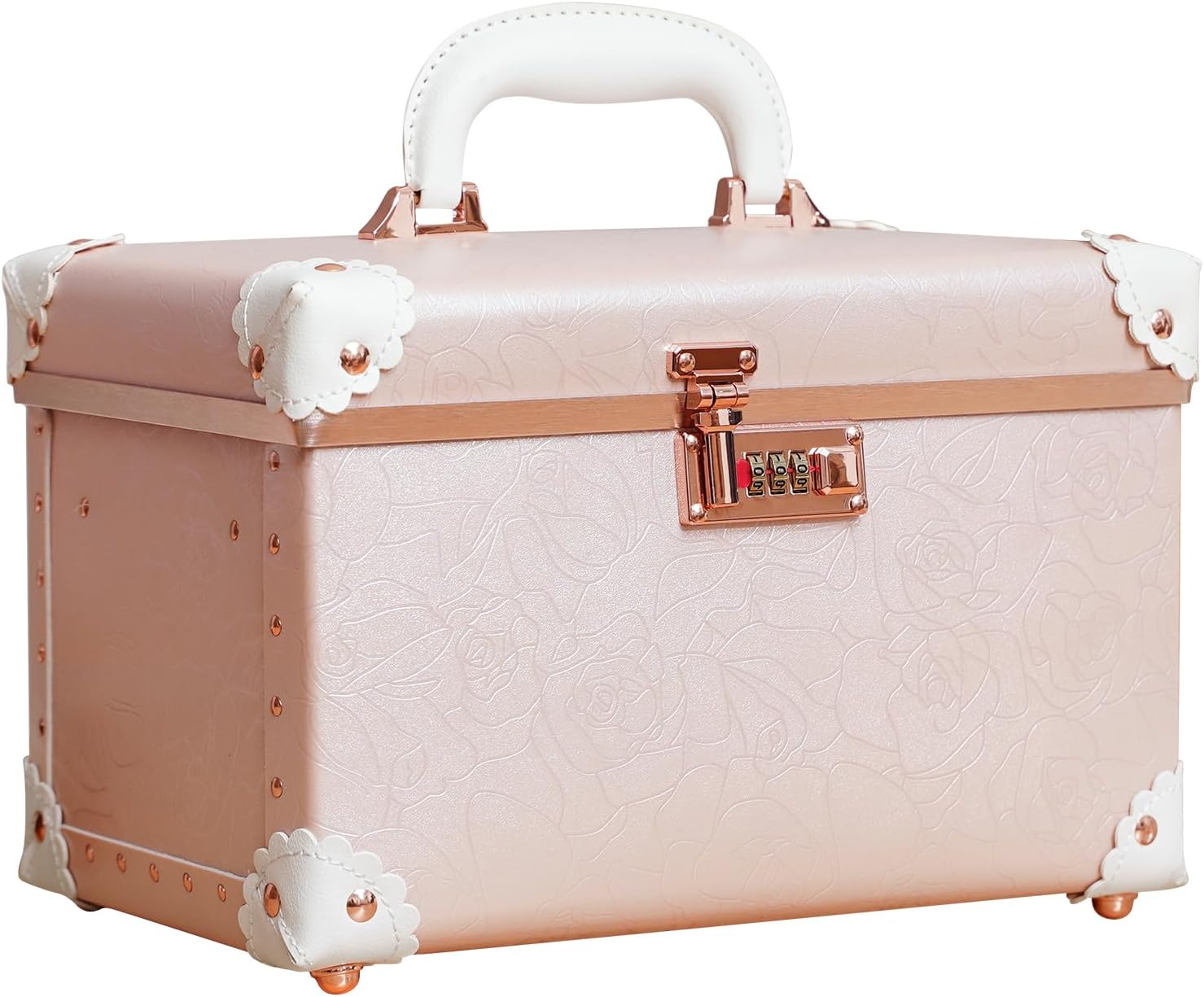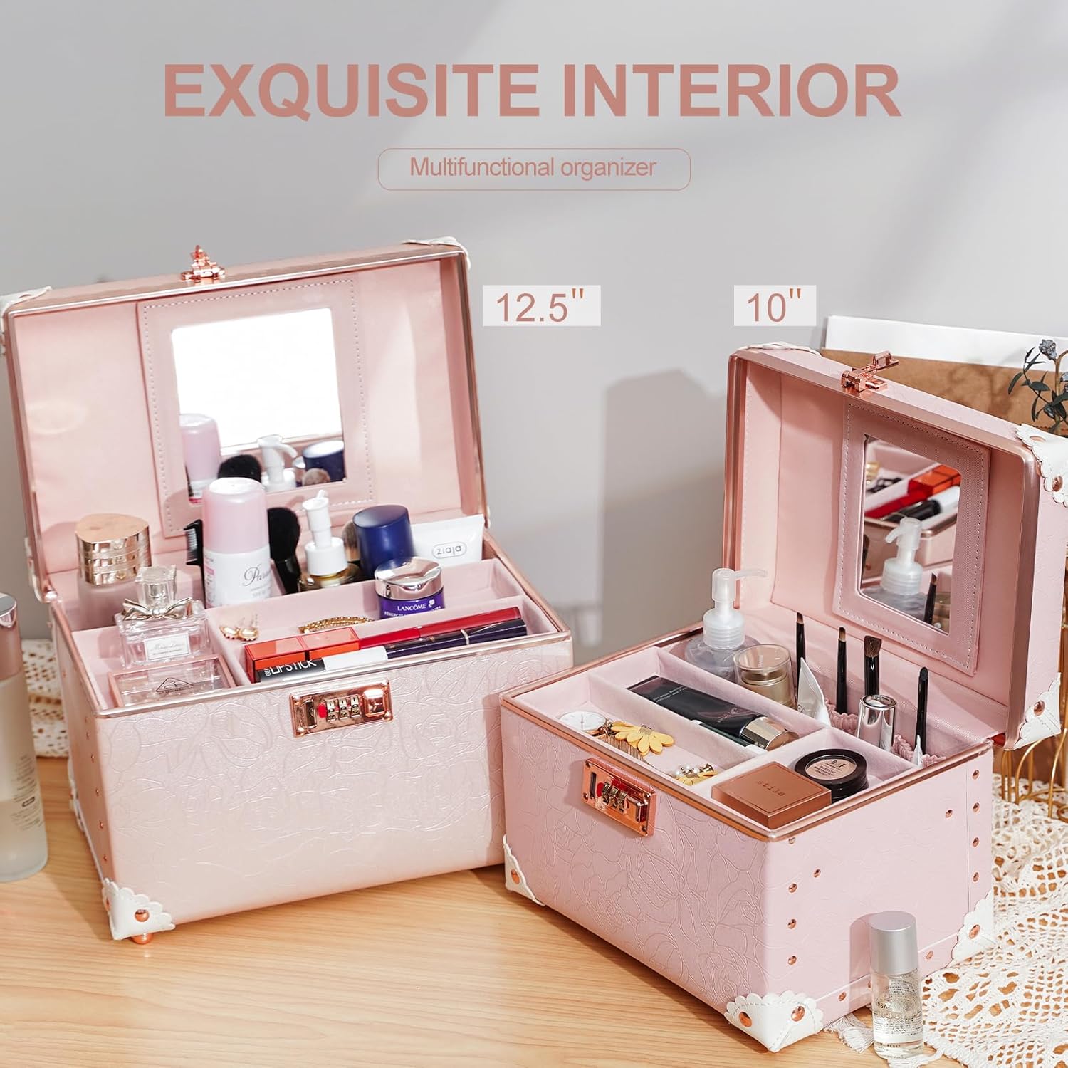 urecity Vintage PU Leather Makeup Train Case 12.5" – Lockable Hard Shell Cosmetic Organizer with Handle, Waterproof Travel Beauty Case for Makeup, Skincare & Accessories (Soft Pink)