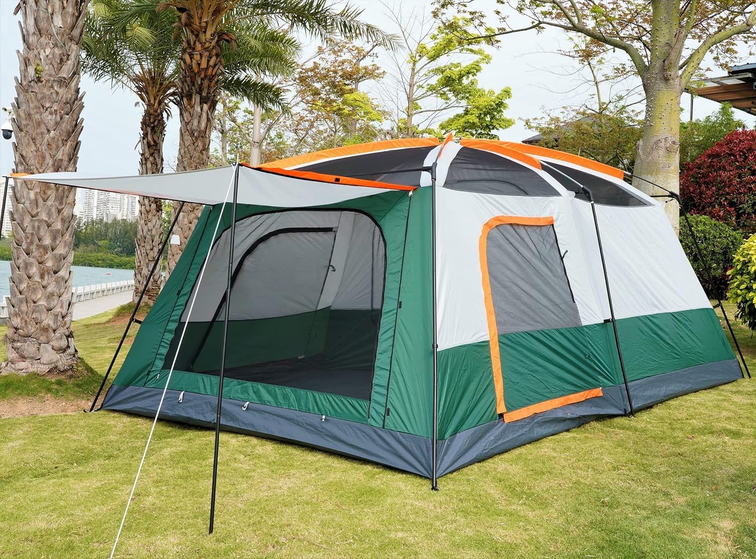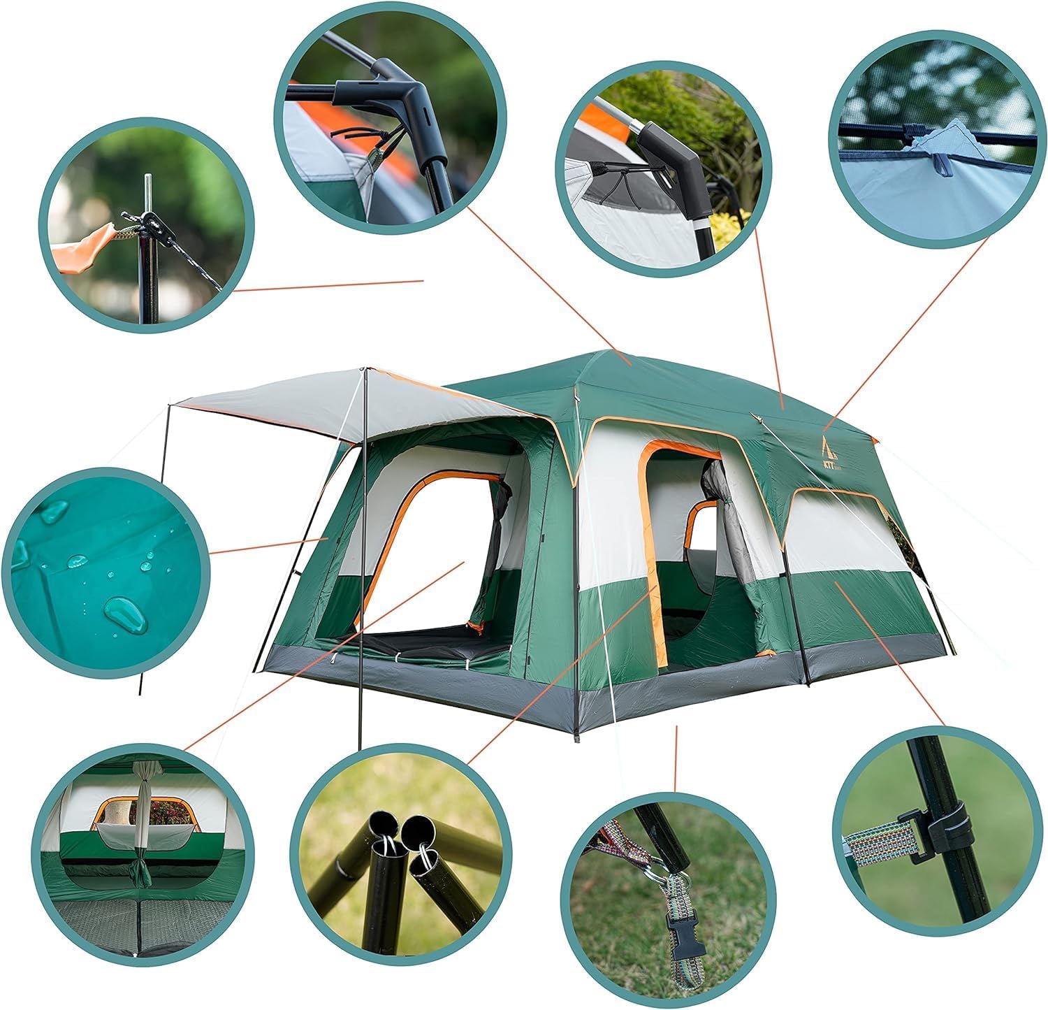 TSB DESIGN New 8-12 person double layer outdoor camping tent, two bedrooms and a living room, family cabin (Green) L Green