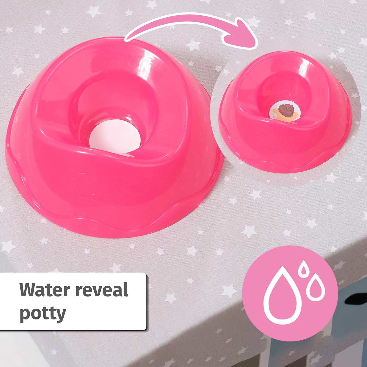- Water magic: a delicious meal with a cute face appears in the plate when in contact with water. The large and small business also appears in the potty.