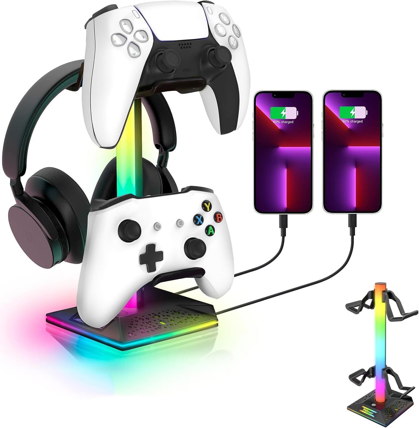 0TO1 TECH Gaming Accessories Stand, Headset Stand, Dual USB Ports, 10 Light Modes, Plus Mating PC Gaming Accessories At the Bottom, Suitable for Headsets /PS5 Controllers/Mobile Phones, Etc
