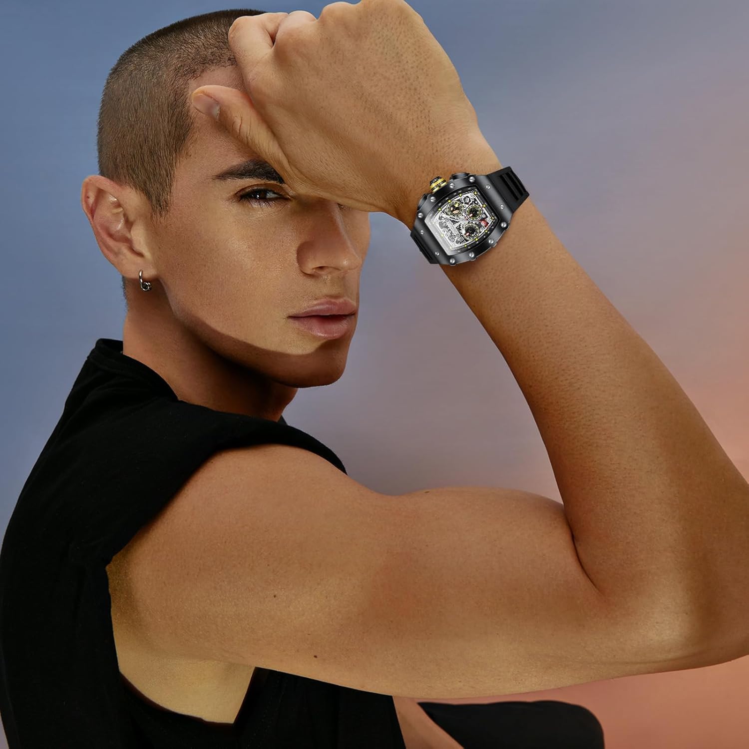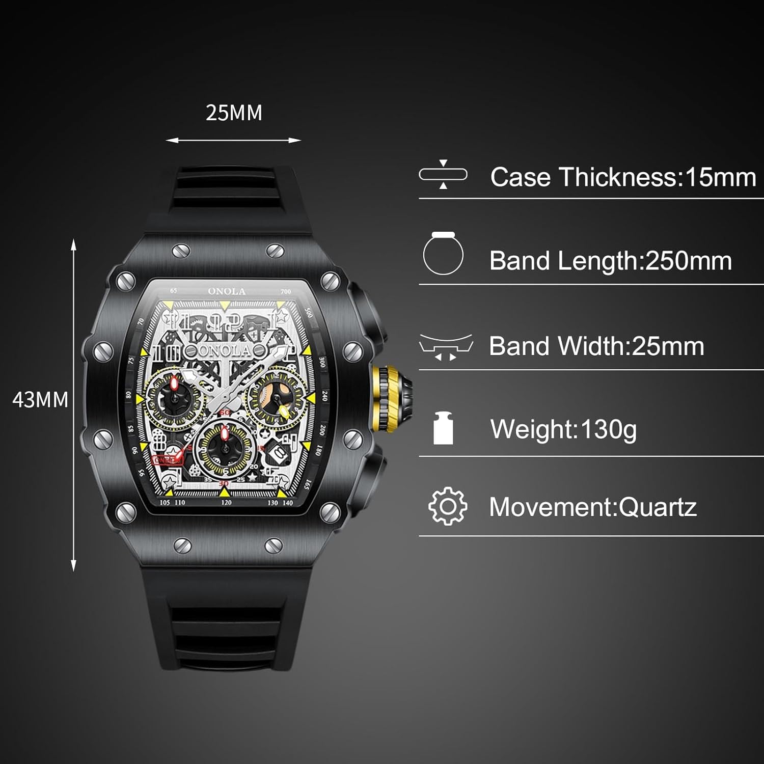 KASTWAVE Multifunctional Watches for Men Sport 5ATM Waterproof Wristwatch Men’s Analogue Quartz Watch Tonneau Punk Watch Fashion Silicone Strap Watch