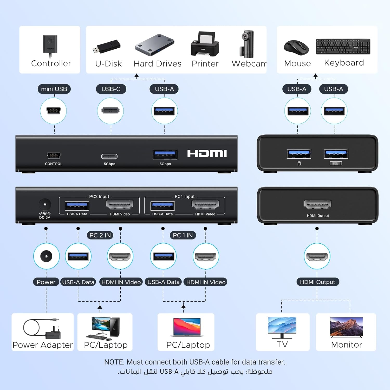 - 【USB 3.0 Data Transfer】The USB A and USB C ports of the HDMI 2 in 1 out splitter support 5Gbps high-speed transmission