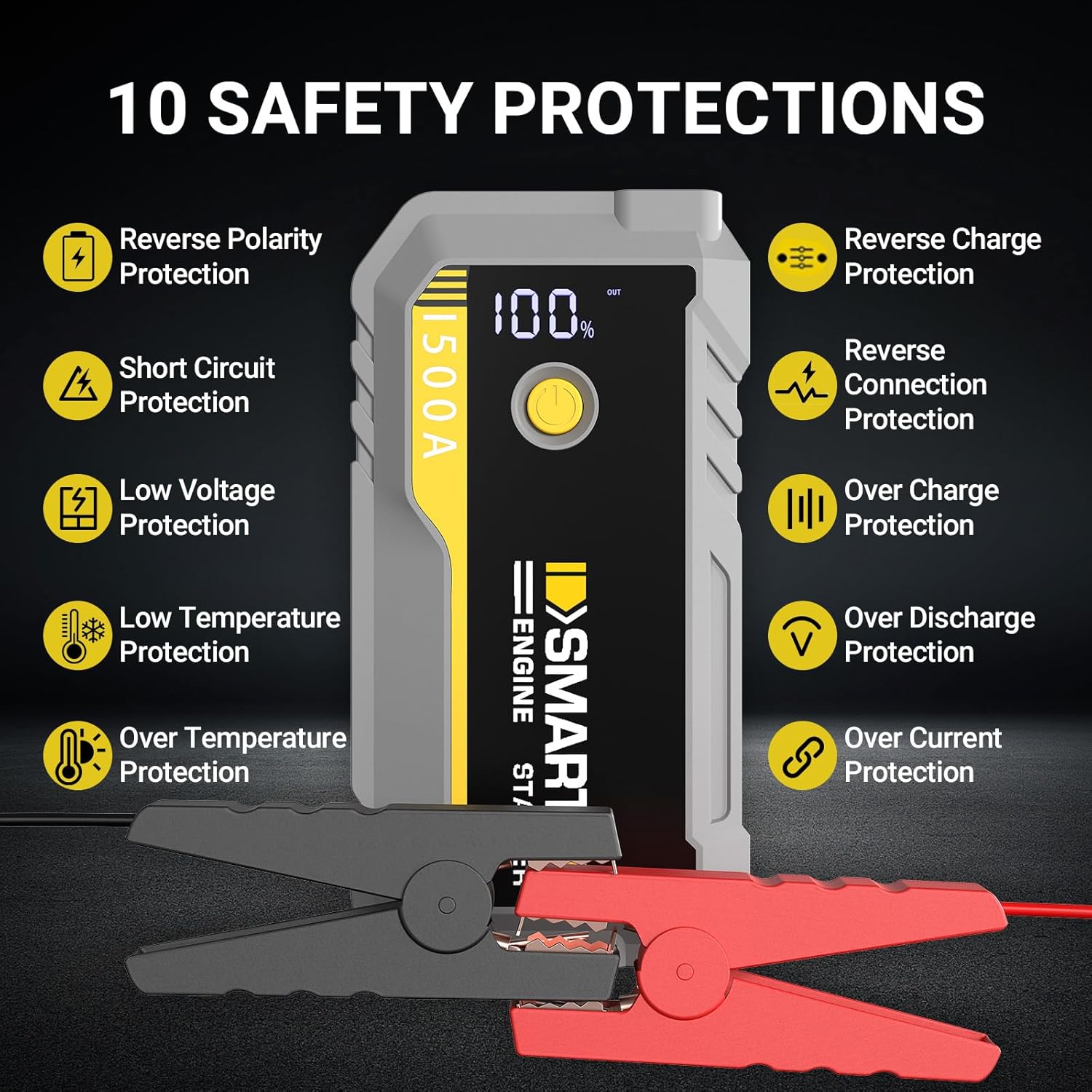 - Car Jumper Starter with Powerful Booster - Car battery jump starter with 1500A peak current safely starts 12V vehicles in seconds - up to 23 jump starts on a single full charge - and rated for gasoline engines up to 8.0-liters and diesel engines up to 6.0-liters. It is suitable for cars