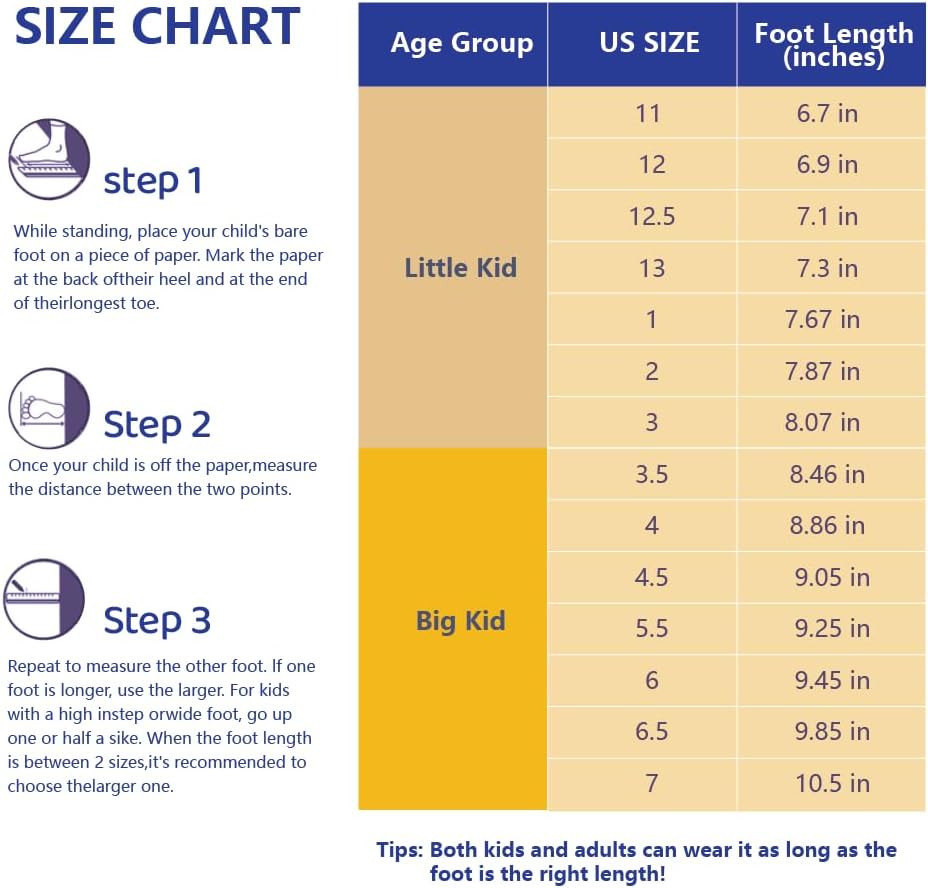 - 【Select size】Please choose the correct size to avoid unnecessary exchanges for you. Size based on foot length not age which measure the insoles of your kid's regular trainers to get they foot length