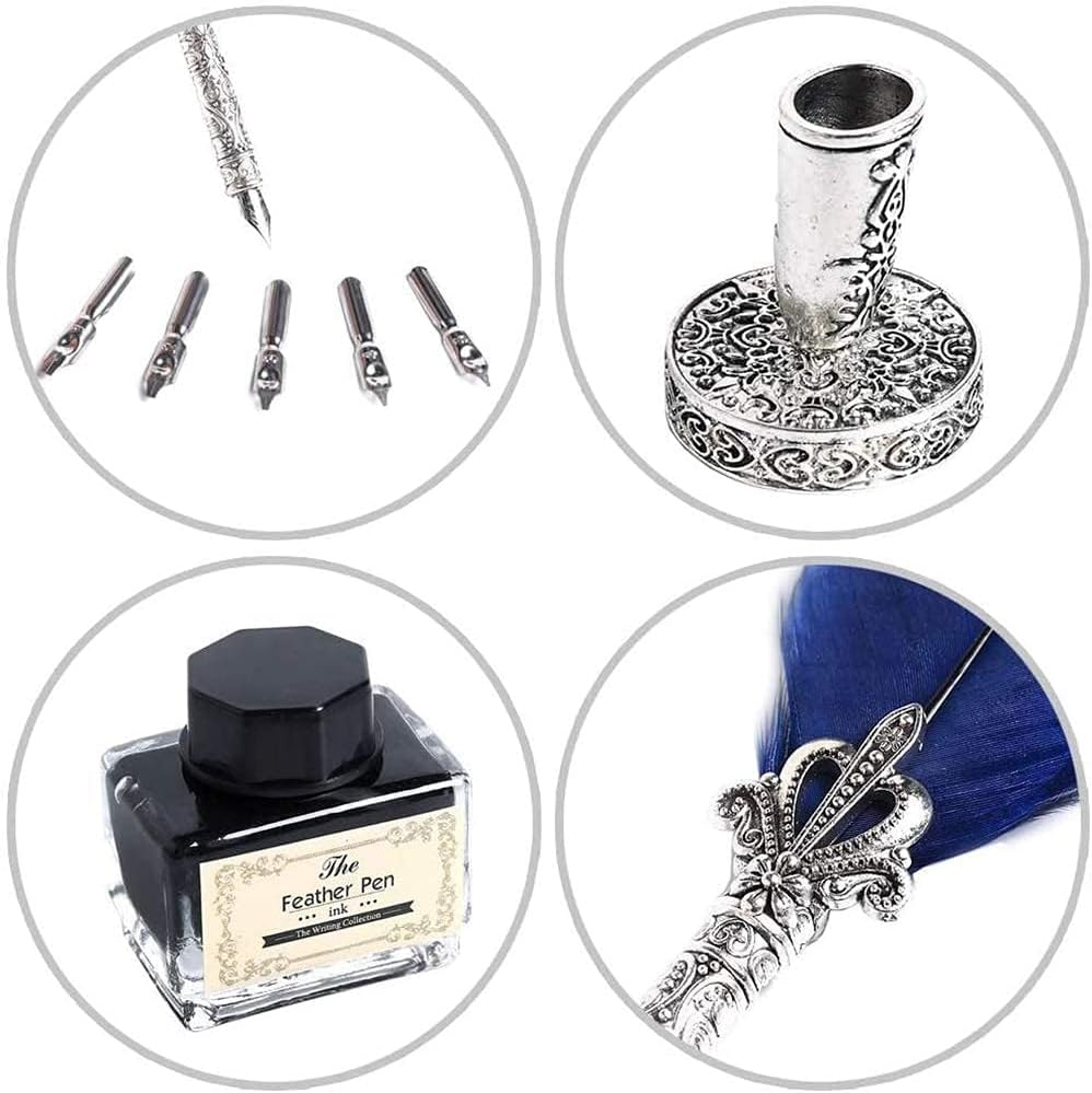 Quill Feather Pen, Antique Dip Quill Pen Calligraphy Writing Ink Pen With Ink, Handmade Quill Feather Pen Set, 6 Replacement Nibs/Contains ink, Ideal For Beginners And Adults (navy blue)