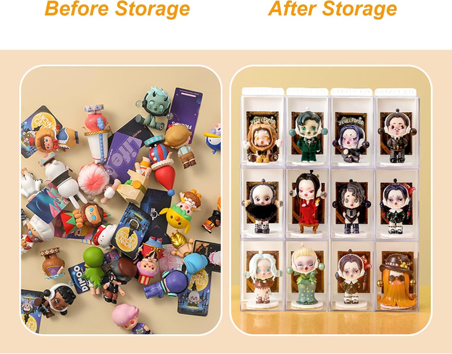 - Id card slot design: Each display case features an ID card slot that prevents the loss of character cards while allowing them to serve as a clear background for showcasing your figures. This design ensures that character identities are immediately visible.