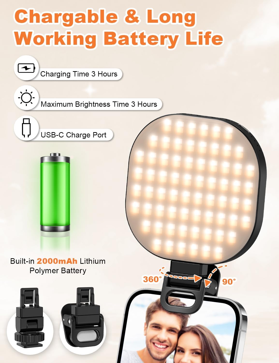- Chargable 4W 300lm photo light: TONEOF selfie light for phone provide soft and powerful light with 142led source and diffuser. You are easy to adjust the lightness and light color with your need with 3 colour temperature modes and 10 levels of brightness for each mode. It also comes with a cold boot interface and clip