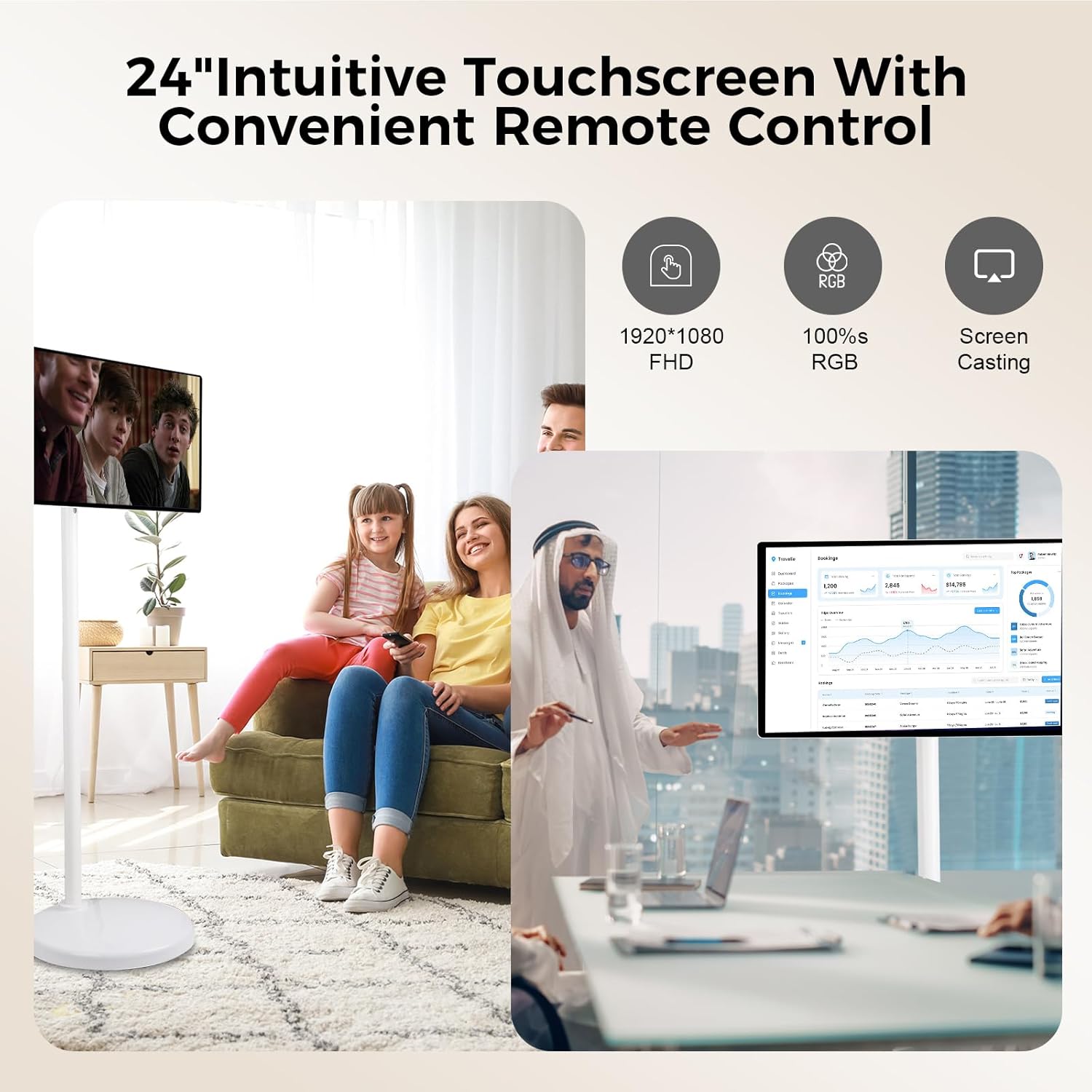- Portable TV on Wheels with 24" Touch Screen Enjoy seamless mobility with built-in 5*360° universal wheels and a lightweight design (16.3kg). The 24-inch FHD (1920x1080) 10-point touch screen delivers vivid visuals and smooth interaction
