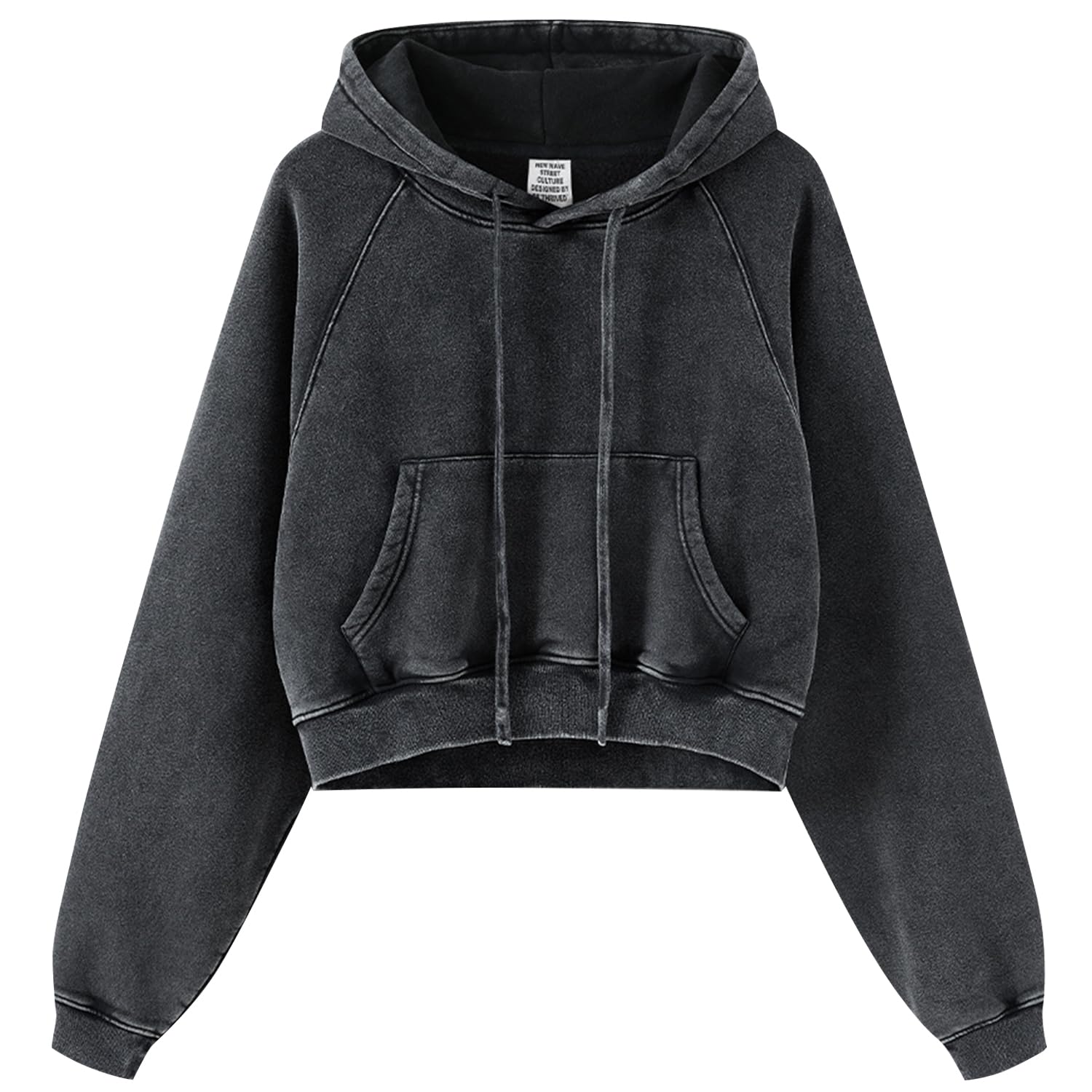 Gihuo Women's Cropped Hoodie Acid Wash Fleece Lined Oversized Short Pullover Sweatshirt L Black